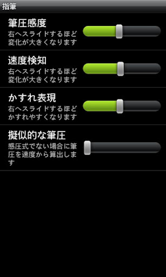 指筆では、メニューボタンの設定から、筆圧や筆の速さ、文字のかすれなどを設定することができます。ただし現バージョンでは初期設定のまま書くと、毛筆の先が割れたような文字になりやすいです。特に細い文字を書きたい場合には、かすれ表現を使わず、筆圧感度も低めにすると比較的しっかりと書くことができます。
